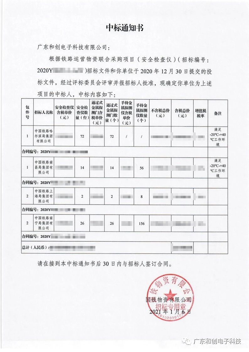 国家铁路集团总公司,公开招标铁路安全检查仪,在经过激烈的竞争之后,开云线上官网凭借良好的产品质量和优异的服务质量中标此次采购项目。中标安全检查设备,包括:“X光行李安检机、金属探测门、手持金属探测仪”。今后的一段时间开云线上官网电子需要为中铁哈尔滨局、南昌局、上海局和南宁局这四家铁路局提供中标通知书中所提到的所有安全检查仪。
